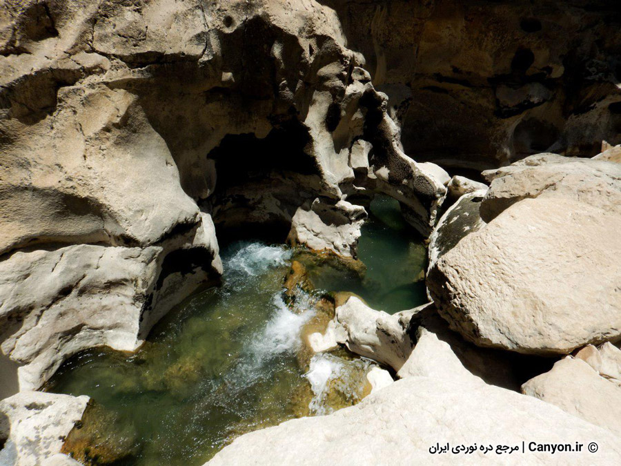 سپس حوضچه عمیق دیگری وجود دارد که در انتها کم عمق می شود و پس از آن خرسنگ های زیادی کف دره هست که آب از زیر آن می رود و مسیر حرکت از سمت چپ و لا به لای خرسنگ ها می باشد .