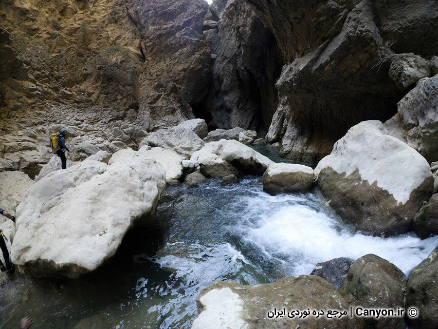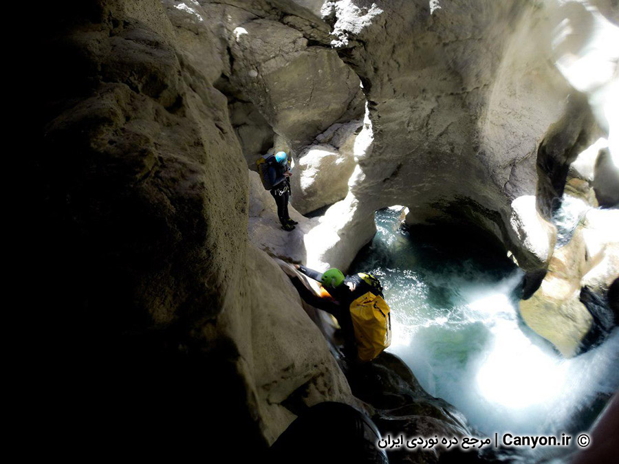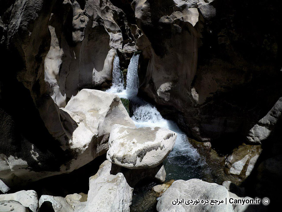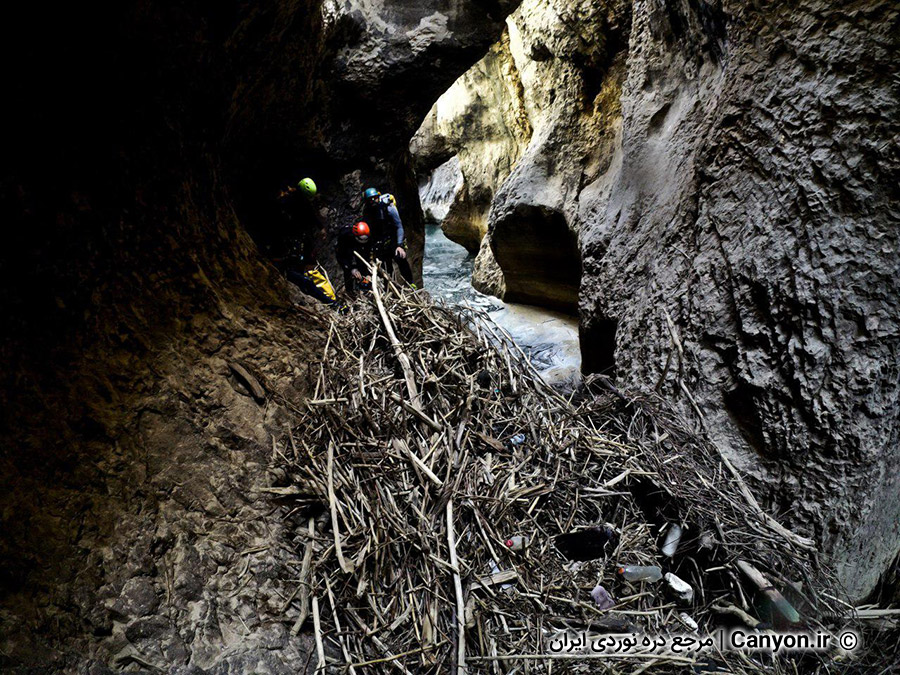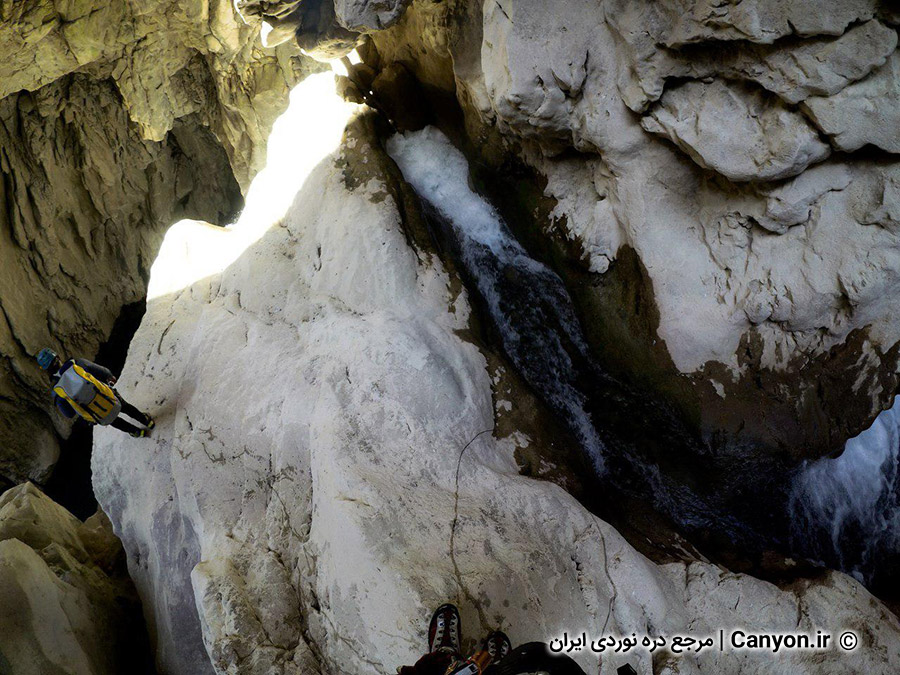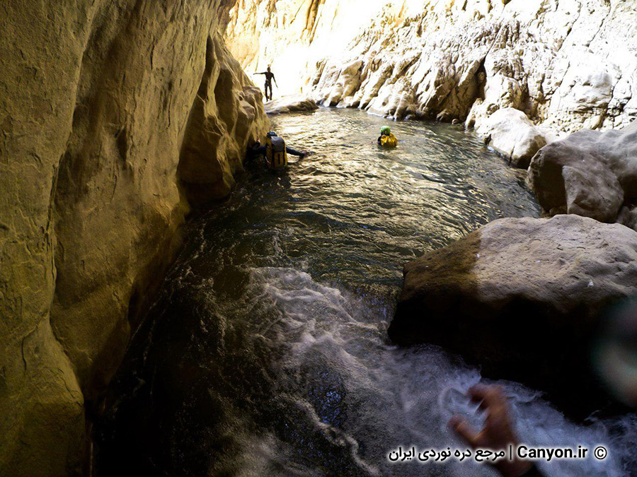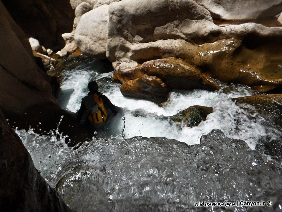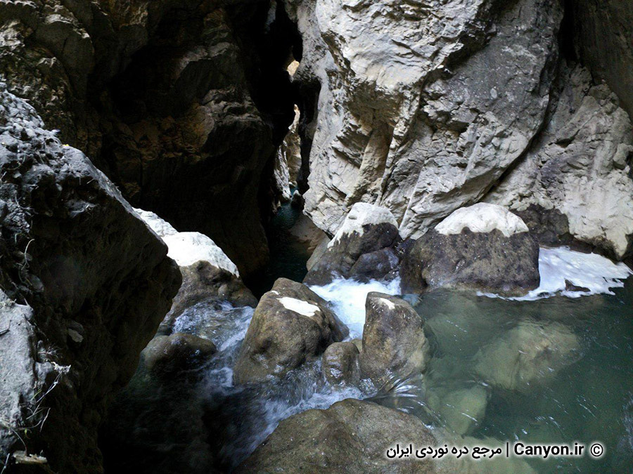 قبل از دره آب رود خانه وارد دره می شود و از همان ابتدا وارد آب می شویم، بستر دره بسیار لغزنده می باشد.