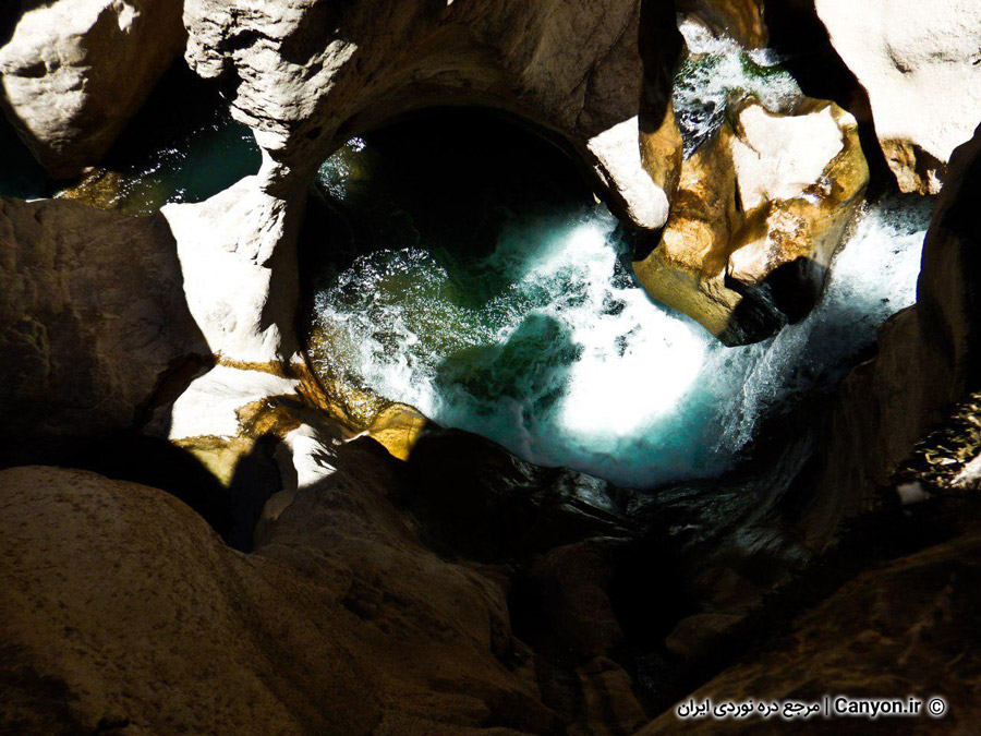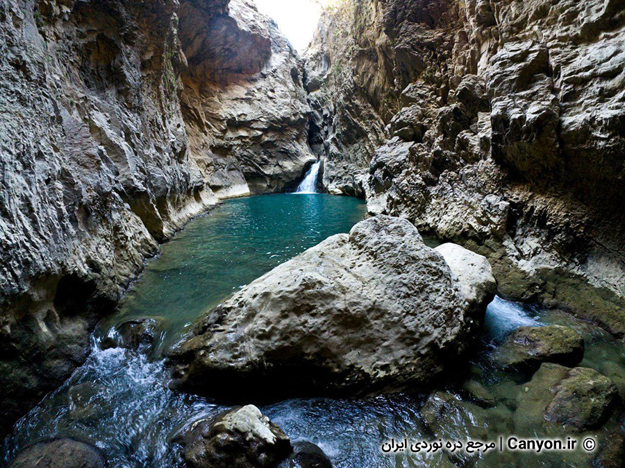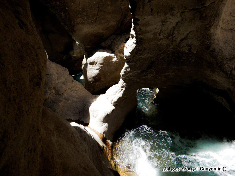 بعد از این حوضچه با تعدادی خرسنگ مواجه می شویم که آب از زیرآنها جریان دارد ابتدا از سمت چپ رفته و بالای خرسنگ ها به سمت راست رفته و ادامه مسیر را از زیر سنگ ها ادامه می دهیم بعد از یک مرحله دست به سنگ از سمت راست یک دست به سنگ دیگر نیز کنار آبشار پایین می رویم و از خرسنگ ها خارج شده و وارد حوضچه عمیق وطولانی بعدی می شویم.