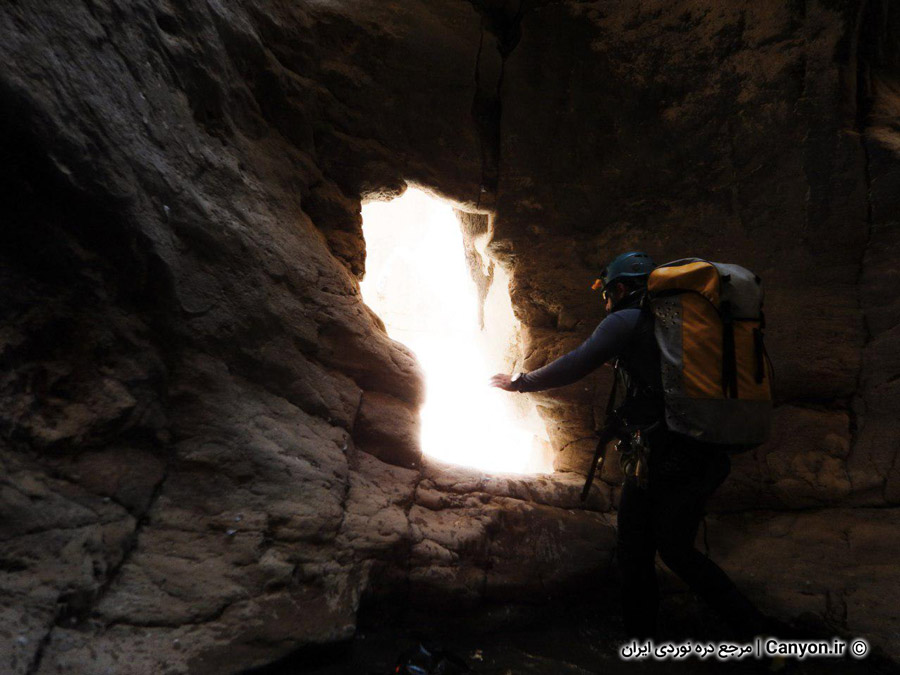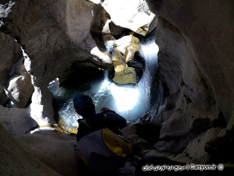 در ادامه آب در سمت چپ جریان دارد ولی می بایستی از روی سنگ های سمت راست پیش رفت در این قسمت نیز خرسنگ های بزرگی وجوددارد که آب از زیر آنها جریان دارد . دراینجا 2 راه وجود دارد یکی سمت راست که درگیری با آب دارد و یکی هم از سمت چپ که وارد یک غرقاب رها کننده شده در دیواره جلویی غرقاب یک سوراخ ایجاد شده که می توان از طریق آن با یک دست به سنگ به سمت پایین و سپس تراورس به چپ خارج شد.