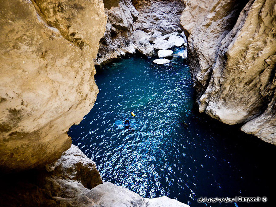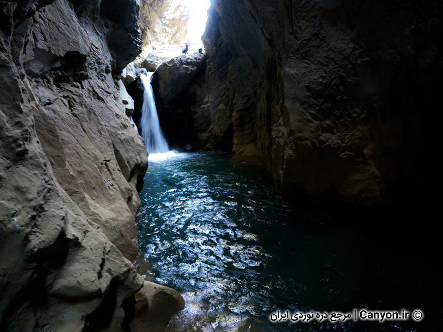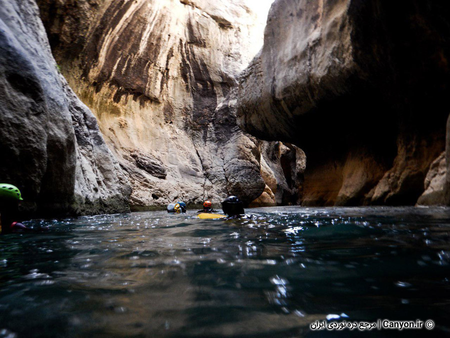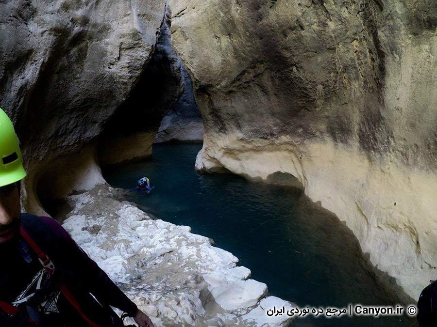 شنا در یک حوضچه طولانی ولی دارای یک نقطه استراحت در سمت راست یک پرش حدودا 6 متری از بالای آبشار کمی پیمایش درون آب کم عمق سپس یک حوضچه عمیق دیگر واتمام دره.
