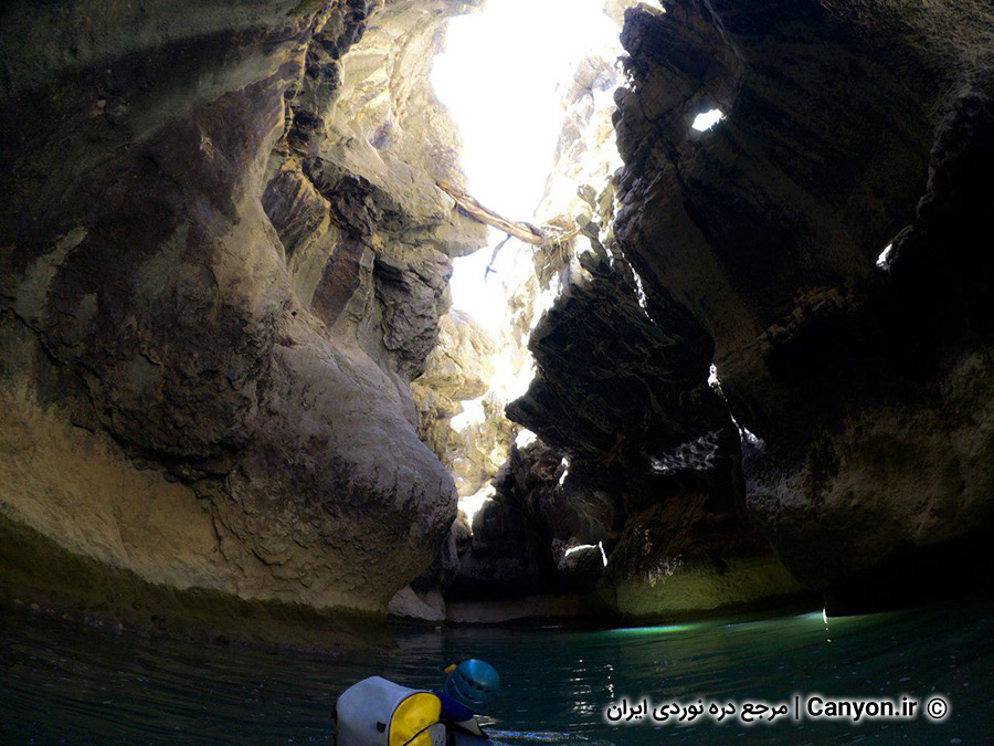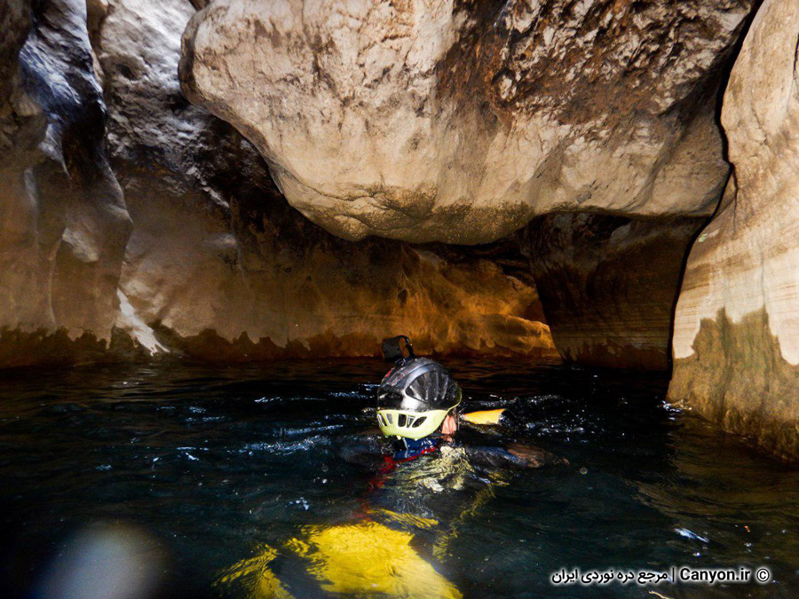 ولی از زیر چوب ها به سمت دیگر یک راه درون آب عمیق به طول تقریبی 5 متر وجود دارد . این قسمت تاریک هست ولی نیازی به هدلامپ ندارد .